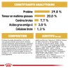 Protéines de volaille déshydratées, riz, farine de maïs, graisses animales, gluten de blé*, protéines animales hydrolysées, pulpe de betterave, substances minérales (dont triphosphate pentasodique (0,35 %)), huile de soja, huile de poissons, produits de levures, fructo-oligosaccharides (0,5 %), levures (source de mannan-oligosaccharides et de bêta-glucanes), huile de bourrache (0,1 %), farine de tagète, jus de Yucca schidigera. *L.I.P. : protéine sélectionnée pour sa très haute digestibilité.