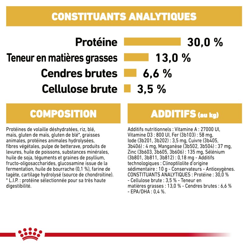 Protéines de volaille déshydratées, riz, blé, maïs, gluten de maïs, gluten de blé*, graisses animales, protéines animales hydrolysées, fibres végétales, pulpe de betterave, produits de levures, huile de poissons, substances minérales, huile de soja, téguments et graines de psyllium, fructo-oligosaccharides, glucosamine issue de la fermentation, huile de bourrache (0,1 %), farine de tagète, cartilage hydrolysé (source de chondroïtine). *L.I.P. : protéine sélectionnée pour sa très haute digestibilité.
