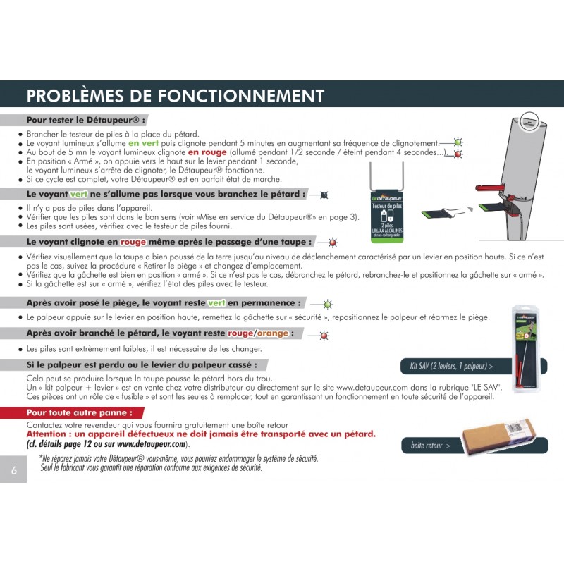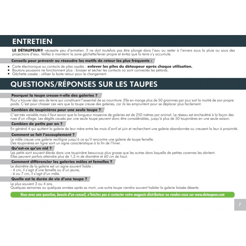 L'efficacité du détaupeur est basée sur l'effet de souffle d'un pétard placé dans la galerie. En venant reboucher sa galerie, la taupe pousse un bouchon de terre faisant remonter le palpeur et déclenche le contact électrique qui provoque l'explosion à l'intérieur de la galerie et la tue.