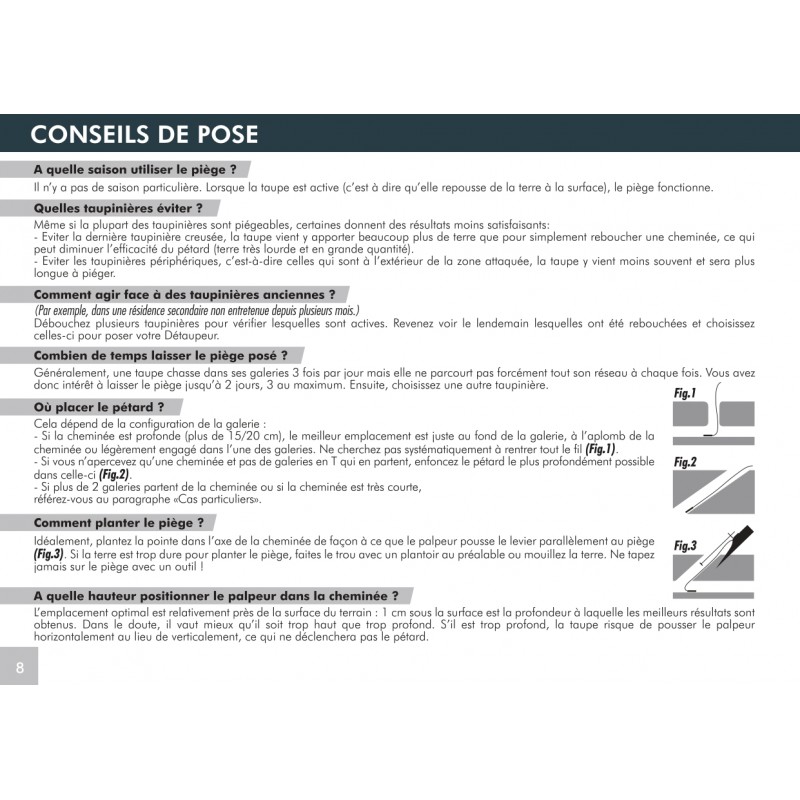 Le DETAUPEUR est un piège à taupes de type pyrotechnique qui exploite un comportement caractéristique de la taupe : elle rebouche systématiquement un trou laissé ouvert.
