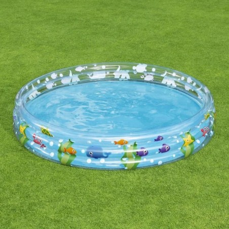 Cette piscine ronde multicolore vous apporte un plaisir rafraîchissant lors des journées chaudes. Elle est fabriquée en PVC robuste avec un imprimé graphique amusant sur le thème sous-marin. La piscine hors-sol est conçue avec des parois composées de 3 anneaux égaux et a une capacité de 480 litres. Elle est livrée avec un patch de réparation.