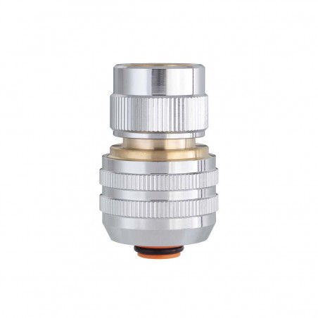 Raccord automatique pour tuyaux avec diamètre 19 mm en laiton chromé. Équipé de vanne pour l’arrêt automatique de l’eau, il doit être monté sur la partie terminale du tuyau; en désenclenchant le raccord, le flux de l’eau est bloqué. Équipé de 6 billes internes pour assurer un enclenchement automatique avec une étanchéité parfaite. La bague de serrage, avec le profil de design exclusif Claber, identifie le produit et en accroît la tenue.