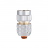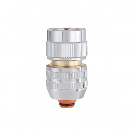 Raccord automatique pour tuyaux avec diamètre 12,5-15 mm en laiton chromé. Équipé de vanne pour l’arrêt automatique de l’eau, il doit être monté sur la partie terminale du tuyau ; en désenclenchant le raccord, le flux de l’eau est bloqué. Équipé de 6 billes internes pour assurer un enclenchement automatique avec une étanchéité parfaite. La bague de serrage, avec le profil de design exclusif Claber, identifie le produit et en accroît la tenue.