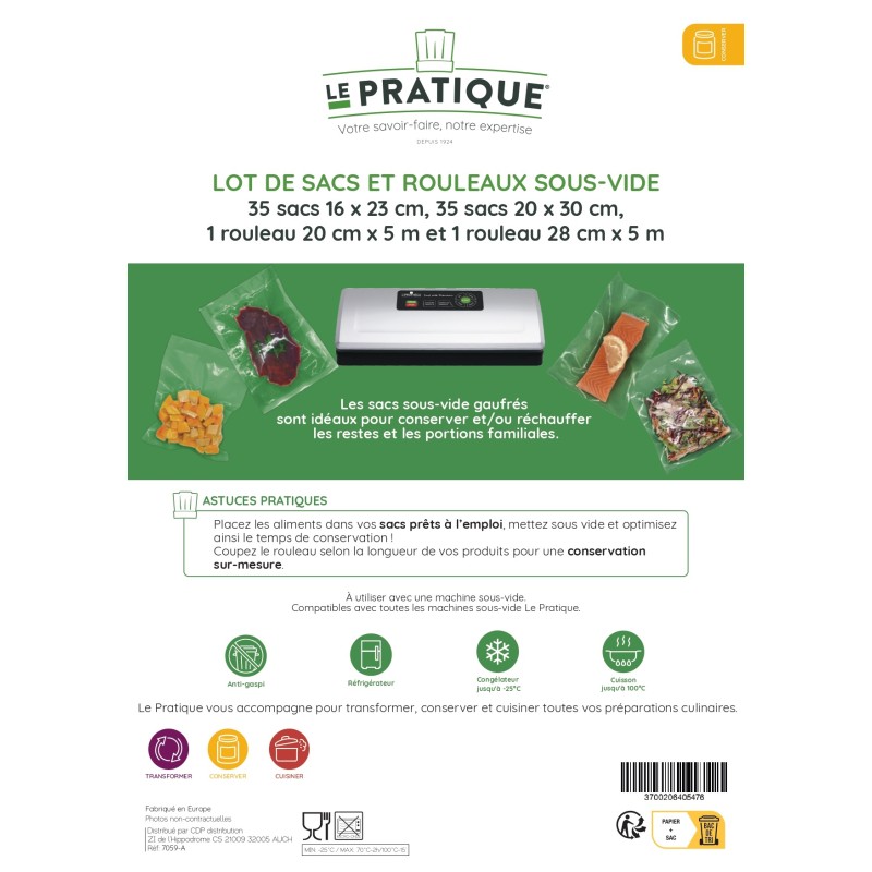 Les sacs sous vide et rouleaux gaufrés Le Pratique peuvent être congelés à -25°C maximum. Les sacs sont aussi adaptés pour une cuisson au bain marie à 70°C pour une durée maximale de 2h et 15 min à 100°C. Utilisable sur machine à vide d'air.