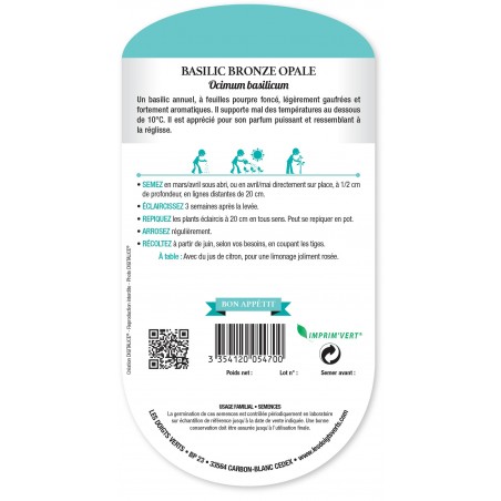 Le Basilic bronze Opale est un basilic annuel, à feuilles pourpre foncé, légèrement gaufrées et fortement aromatiques. Il supporte mal des températures au dessous de 10°C. Il est apprécié pour son parfum doux et ressemblant à la réglisse.