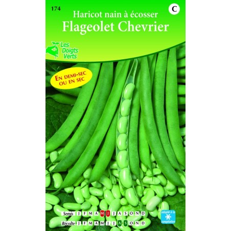 RÉCOLTE : E nviron 3 mois après le semis pour une récolte en demi-sec. Lorsque que les grains sont bien formés et que la première gousse commence à se rider, arrachez les pieds, et laisser les sécher à l’ombre afi n d’obtenir un grain bien vert , à peau très fine qui donne sa particularité au fl ageolet. Ecossez frais pour congeler ou laissez sécher le pied pour une récolte en sec.