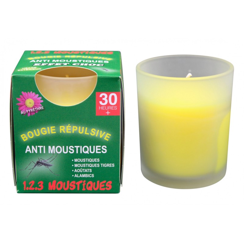 Les bougies 1.2.3 Moustiques sont de véritables bougies répulsives, elles permettent d’éliminer et repousser toutes les espèces de moustiques, dont le moustique tigre, les aoûtats, les alambics ainsi que tous les insectes volants qui peuvent présenter une nuisance sur tous les extérieurs de la maison : jardin, terrasse, cour, patio, rebord de fenêtre, camping.