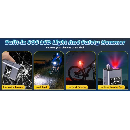 Alimentation mobile et lampe LED 3 en 1 : la pompe à ballon électrique peut non seulement être utilisée comme alimentation mobile pour recharger votre téléphone portable, mais la lampe LED peut également servir de torche pour vous permettre de réparer votre voiture la nuit. La lampe LED dispose de trois modes : lampe de poche, SOS et stroboscope. Le mode stroboscope SOS et le marteau de secours peuvent augmenter vos chances de survie en cas d'urgence. Il est recommandé d'attendre au moins 15 minutes après chaque utilisation afin que la pompe à ballon électrique de votre voiture puisse refroidir avant de continuer à l'utiliser.