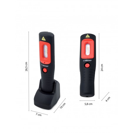 Lampe d'atelier super lumineuse: la lanterne SMD 300 Lumen 3W est une puissante lampe de travail blanche qui sert à éclairer une grande surface. Faisceau visible jusqu'à 20 mètres. Poignée antidérapante en caoutchouc. Rechargeable: la lampe intègre une batterie Li-ion rechargeable de 3,7 V 2200 mAh (type 18650); fournie avec 2 chargeurs (voiture 12V et maison 220V) et base de chargement. Autonomie: 8 heures (lumière 50%); 4 heures (lumière 100%). Crochet pivotant à 360 ° la lampe monte un crochet pivotant à 360 ° qui vous permet de suspendre la lampe n'importe où facilement. Aimant: l'arrière de la lampe monte un aimant puissant: il vous permet de le fixer sur des surfaces métalliques afin de laisser les mains libres pour effectuer d'autres travaux. Résistante à l'eau et robuste (structure en ABS), elle est confortable à utiliser. Elle peut être utilisée à l'intérieur et à l'extérieur, pour la maison, le travail, le camping, en cas d'urgence, dans la voiture, le garage, au travail (électriciens, mécaniciens, plombiers ...).