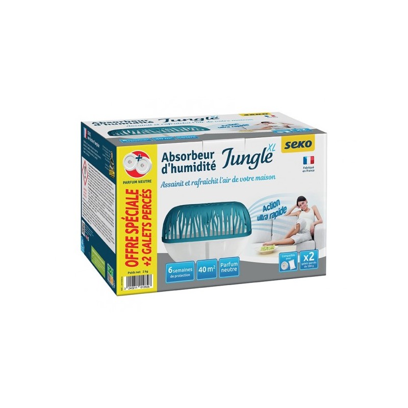 - Absorbeur d'humidité jungle XL + 2 galets 500g.- Facile d'usage, sûr et sans risque pour l'environnement.
