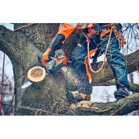 Husqvarna T542i XP® est la première tronçonneuse élagueuse à batterie avec embrayage au monde, ce qui procure une sensation unique et une capacité exceptionnelle. Cette puissante tronçonneuse à batterie 36V à poignée supérieure est un outil très efficace pour les grimpeurs d'arbres professionnels qui souhaitent bénéficier de tous les avantages de la puissance électrique sans fil dans l'arbre, combinés au contrôle et à la réponse d'une tronçonneuse thermique. La vitesse élevée de la chaîne, le guide-chaîne X-PRECISION™ et la chaîne SP21G efficace permettent des coupes rapides et précises.