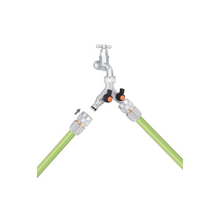 Prise à deux voies en laiton chromé. Elle permet le raccord de deux lignes équipées de raccords automatiques Quick-Click à une unique prise d’eau. Robinets à réglage indépendant. Installation sur robinet avec filet de 20-27 mm.