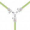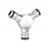 Déviateur à 3 voies en laiton chromé. Pour dédoubler la ligne d’arrosage et amener l’eau dans deux points différents. Trois tuyaux avec raccords automatiques aux extrémités sont raccordés.