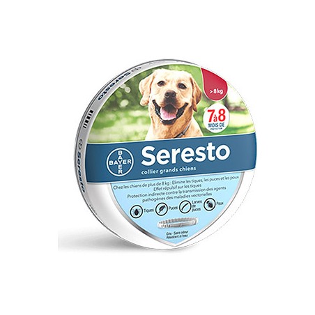 Le collier Seresto est efficace pendant 8 mois contre les tiques, les puces et les larves de puces chez les chiens. Seresto réduit également les risque de leishmaniose. Seresto est composé d'une matrice polymère brevetée chargée en principes actifs insecticides ( imidaclopride 10 % et fluméthrine 4.5%). Ce collier insecticide innovant est utilisable chez le chiot à partir de l' âge de 7 semaines. Le mouillage du chien par la pluie n' altère pas l' efficacité du collier, par contre celle-ci est momentanément altérée en cas de shampoing.