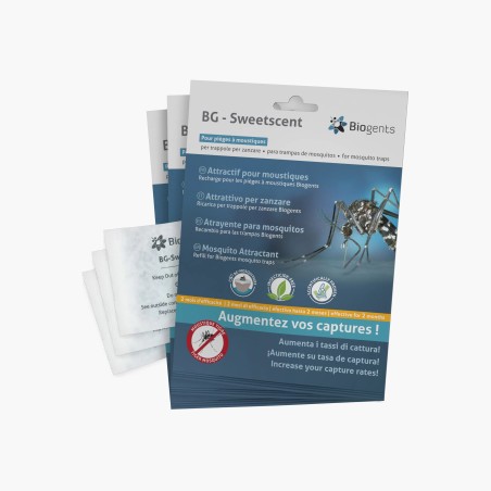Le sachet se met à l'intérieur du piège et chaque sachet est efficace jusqu'à deux mois. L'attractif BG-Sweetscent pour piège à moustiques peut s'utiliser avec le BG-Mosquitaire (avec ou sans CO2), le BG-Home ou d'autres pièges qui attirent les moustiques piqueurs.