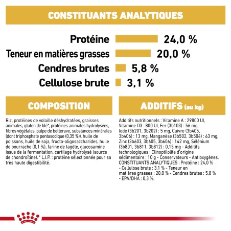 Riz, protéines de volaille déshydratées, graisses animales, gluten de blé*, protéines animales hydrolysées, fibres végétales, pulpe de betterave, substances minérales (dont triphosphate pentasodique (0,35 %)), huile de poissons, huile de soja, fructo-oligosaccharides, huile de bourrache (0,1 %), farine de tagète, glucosamine issue de la fermentation, cartilage hydrolysé (source de chondroïtine). *L.I.P. : protéine sélectionnée pour sa très haute digestibilité.