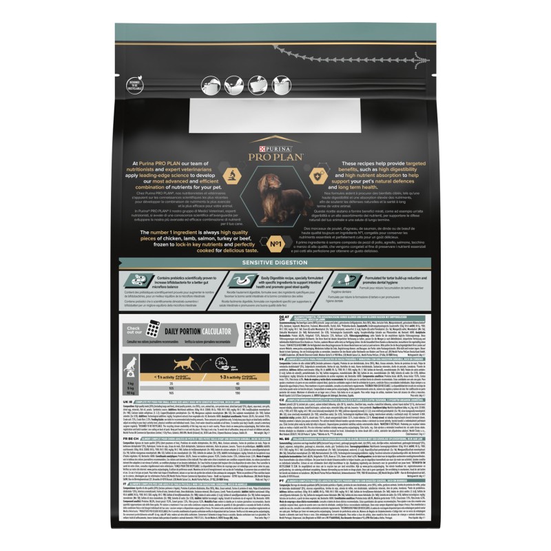 PURINA® PRO PLAN® Sensitive Digestion avec OPTIDIGEST™ sont des croquettes formulées avec des morceaux d'Agneau de haute qualité, spécialement conçues pour les chiens adultes de petite taille ayant une digestion sensible.