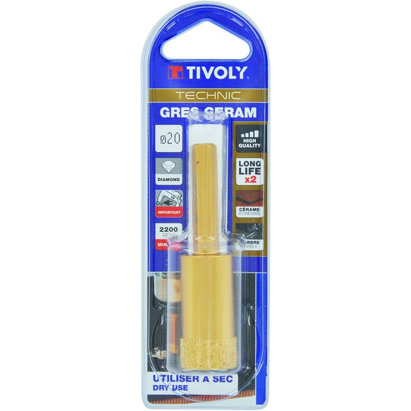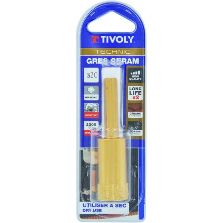 Foret performant pour le perçage en rotation des matériaux types grès cérame, carrelage classe IV-V grâce à sa concrétion de grains diamant et sa lubrification intégrée. Perçage à sec.
