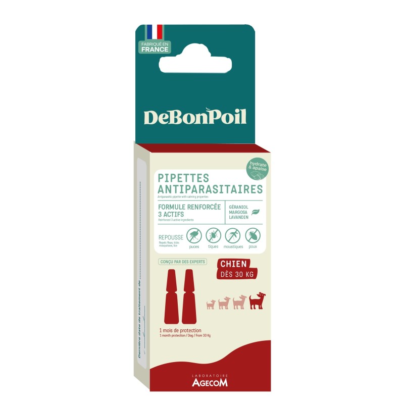 Protégez votre animal avec les pipettes insectifuges DEBONPOIL, la solution efficace contre les parasites. Nos pipettes ont été spécialement conçues par des experts en soins pour animaux de compagnie pour garantir la meilleure efficacité et sécurité à votre animal. Chaque substance active a été sélectionnée pour son action spécifique sur les parasites externes (puces, tiques, moustiques et poux). La combinaison du Géraniol, du Margosa et du Lavandin créée une action renforcée. La formule a été enrichie avec de l’huile d’amande douce pour nourrir et hydrater la peau et le poil de votre animal, tout en calmant d’éventuelles démangeaisons. L’application de 2 pipettes vous assure une tranquillité d’esprit pour une durée d’un mois environ. Pensez à renouveler l’application tous les mois.
