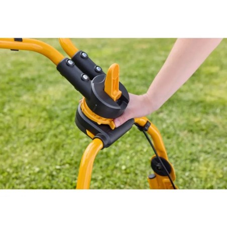 La tondeuse mulching Multiclip 747e V te permet de t'attaquer à de plus grandes pelouses à ton rythme, grâce à un clavier facile à utiliser, doté d'un mode éco et de six vitesses différentes. Alimentée par deux batteries 48V 7,5Ah et un chargeur inclus, et boostée par un moteur alimenté par une brosse de 1,5kW à économie d'énergie, la Multiclip 747e V peut couvrir jusqu'à 2000 m2 en 75 minutes avec une seule charge. La flexibilité et le confort sont également des caractéristiques importantes de cette machine. Tu peux facilement régler le guidon soft grip à la bonne hauteur et à la bonne position, à l'aide de camlocks robustes. Et pour obtenir une coupe parfaite en toute saison, il suffit de régler le Multiclip 747e V sur cinq hauteurs différentes. Une façade en plastique solide protège cette tondeuse tractée contre les coups et les bosses. Puis, lorsque tu as terminé, il te suffit de replier le guidon vers l'avant et de ranger facilement la machine.