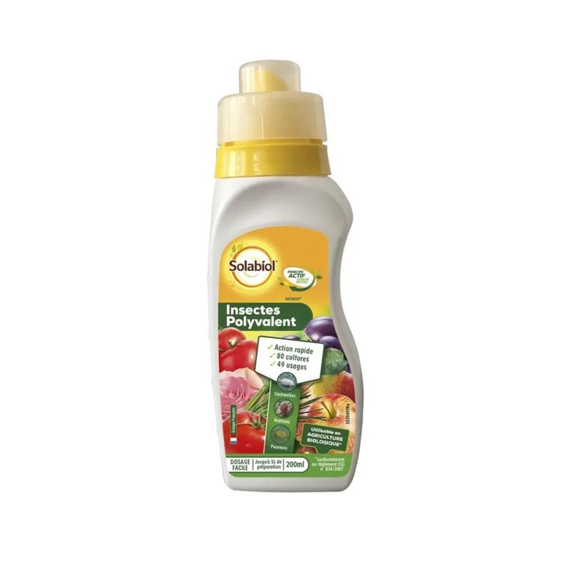 Insectes Polyvalent Concentré a une action insecticide et acaricide. Il permet d’éliminer rapidement pucerons, cochenilles, aleurodes, acariens, punaises, thrips… sur les principales cultures du jardin, les arbres et les arbustes.