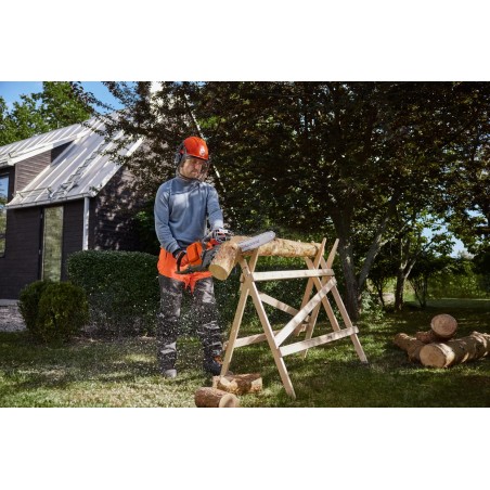 La tronçonneuse à batterie Husqvarna 240i a été développée pour offrir une puissance élevée et une grande facilité d'utilisation. Sa conception compacte et légère permet de réaliser les travaux confortablement et de manière ergonomique. Lors de la coupe de bois de chauffage ou de l'abattage d'arbres dans le jardin, la technologie Max Torque garantit une puissance fiable et réduit le risque de blocage de la chaîne dans le bois. L'utilisateur bénéficie également d'une expérience améliorée grâce au clavier convivial avec bouton ON/OFF et au corps de tronçonneuse bien équilibré. La dépose de la batterie est facilitée par son positionnement horizontal à travers la machine qui réduit le risque de pénétration de saletés et de copeaux dans le compartiment. La 240i fait partie du système flexible BLi-X 36 V d'Husqvarna, qui permet d'utiliser la même batterie sur plusieurs outils. Disponible en option avec tension de la chaîne sans outil.
