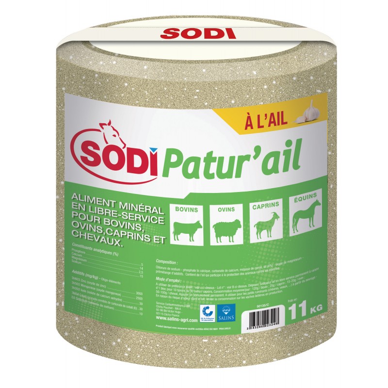SodiPatur'ail est un bloc à lécher à l'ail qui contribue à protéger les animaux. Après ingestion, l’ail émet des composés volatils soufrés qui agissent comme une barrière odorante vis-à-vis d’un grand nombre d’insectes (mouches, tiques,…).