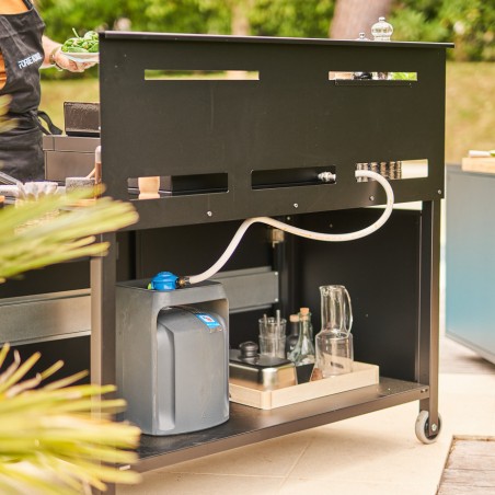 Pratique et esthétique, cette table roulante trouvera sa place sur votre terrasse, sous la pergola et dans votre jardin. Cuisinez confortablement et rangez votre vaisselle, vos accessoires et votre bouteille de gaz en toute discrétion... En acier noir, cette table roulante bénéficie du revêtement 3 couches qui lui confère une meilleure résistance aux chocs, aux UV et à la corrosion.