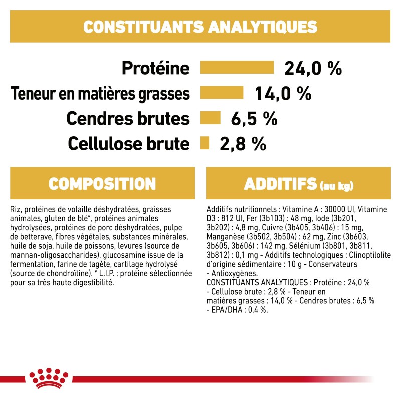 Riz, protéines de volaille déshydratées, graisses animales, gluten de blé*, protéines animales hydrolysées, protéines de porc déshydratées, pulpe de betterave, fibres végétales, substances minérales, huile de soja, huile de poissons, levures (source de mannanoligosaccharides), glucosamine issue de l a fermentation, farine de tagète, cartilage hydrolysé (source de chondroïtine). *L.I.P. : protéine sélectionnée pour sa très haute digestibilité.