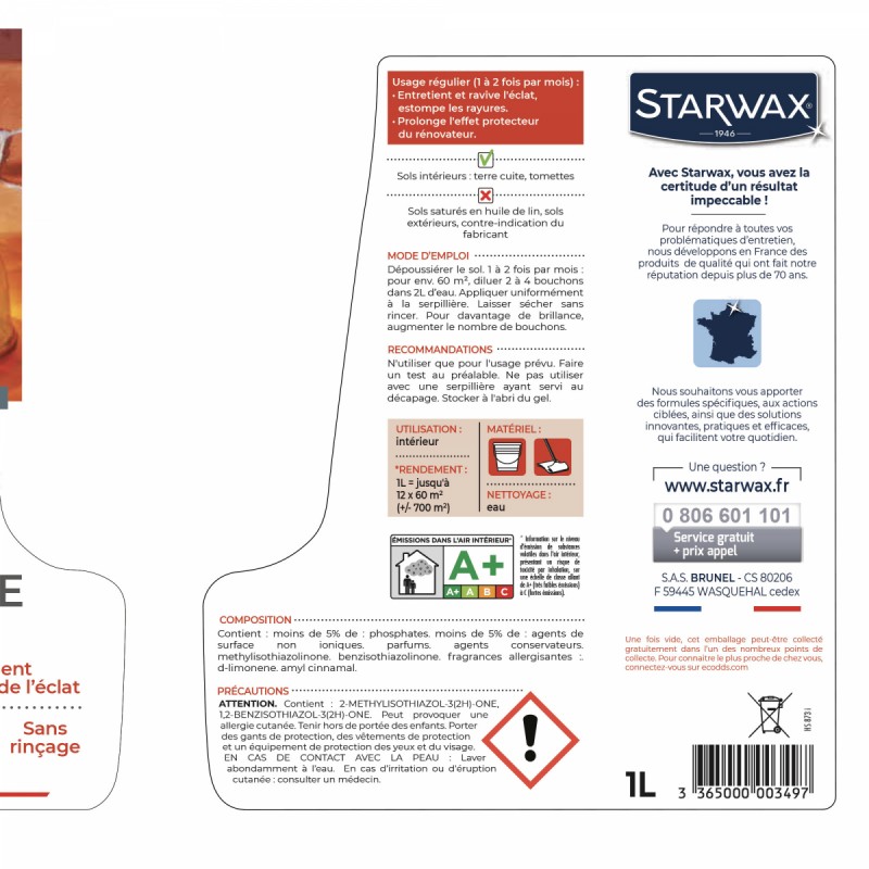 Le Lait de brillance pour tomettes et terres cuites nettoie et ravive la brillance en une seule opération. Il renforce la brillance et l’effet protecteur du Rénovateur brillant protecteur tomettes Starwax. N’ayant pas besoin de rinçage, il est facile d’utilisation pour un résultat non glissant.