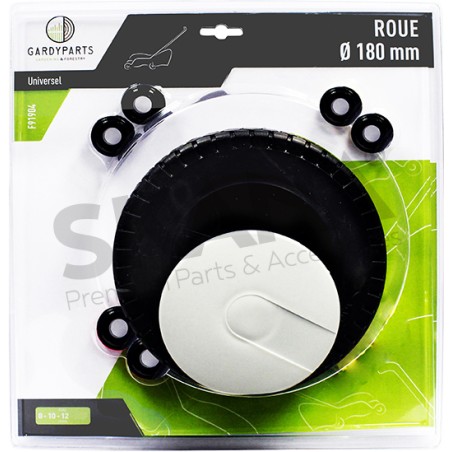 Roue universelle plastique Ø : extérieur  : 180mm, livrée avec enjoliveur et jeux de bagues de réduction 8, 10 et 12 mm. (sous coque).