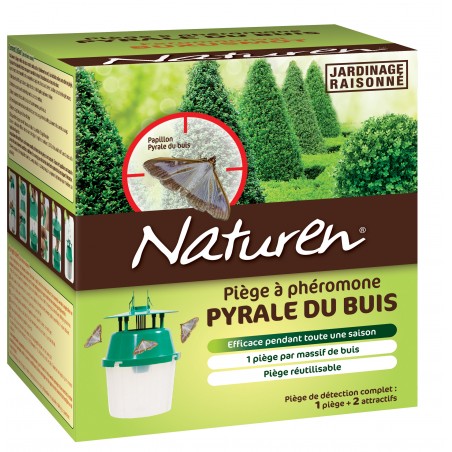 Les pièges à phéromones permettent d'attirer les mâles adultes (papillons) de pyrale du buis, dont les larves se dévorent les feuilles des buis, causant leur dépérissement, Le piège permet ainsi de limiter la reproduction mais constitue surtout un moyen efficace de détection. Chaque capsule de phéromone dure jusqu'à 3 mois (soit une durée d'action de 6 mois au total),