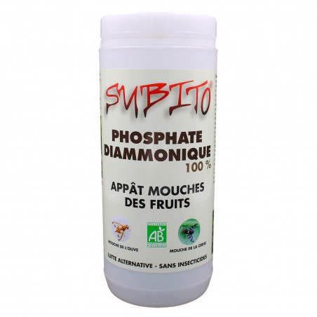 Le Subito phosphate diammonique est une méthode alternative sans insecticide pour attirer et lutter contre les mouches des arbres fruitiers tels que les oliviers, cerisiers, agrumes, figuiers, pommiers,...